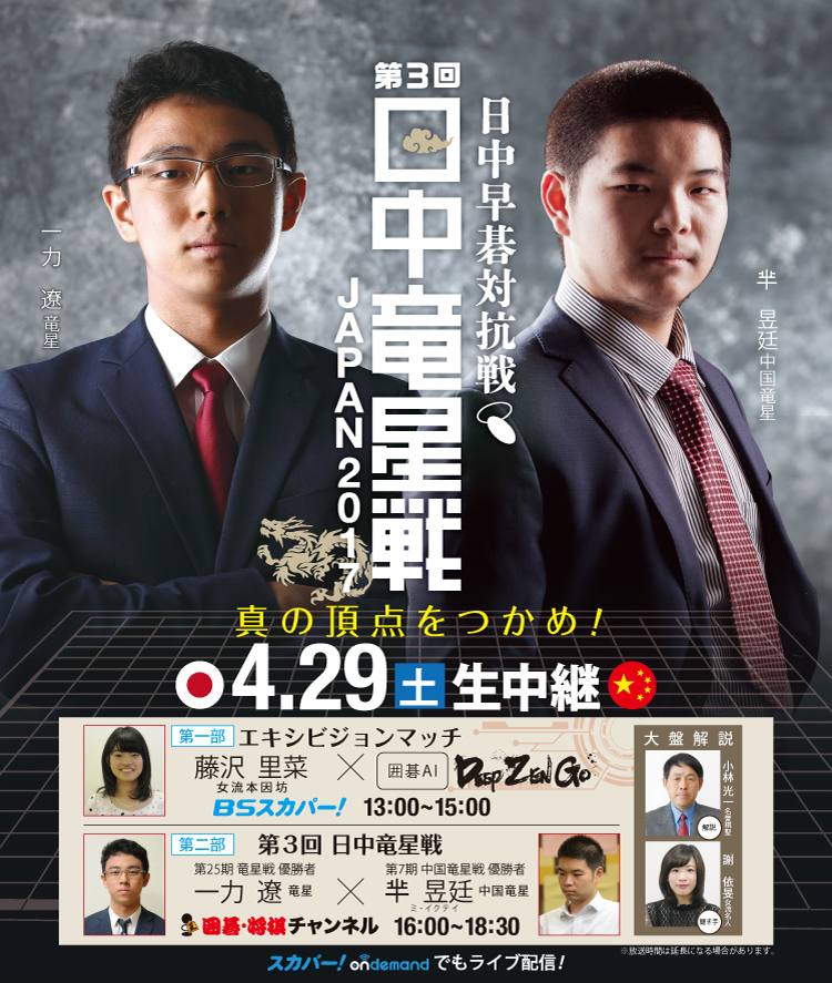 囲碁・将棋チャンネルが日中両国で開催している公式テレビ囲碁棋戦、「竜星戦」&「中国竜星戦」。その優勝者同士による頂上対決が、日中早碁対抗戦『日中竜星戦』です。2014年に第1回を日本で、2016年に第2回を北京で開催し、第3回となる今回は再び東京が決戦の舞台。対局は第一部のエキシビションマッチ終了後に開始となり、第一部同様に大盤解説会を実施します!