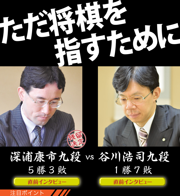 一方、深浦康市九段にとってもA級順位戦での経験は決して楽なものではなかった。それまでは昇級した期のA級順位戦で必ず陥落してしまうという不名誉なジンクスがあったが、その苦々しい記録も前期で幕を閉じた。今期は既に残留を決めており、その中にはタイトルホルダーの羽生三冠・渡辺二冠両者に勝った一局が光る。今期のA級順位戦は、深浦にとってこの先の新たなステージへ進む始まりの一期となったであろう。