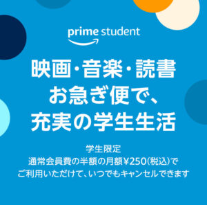 月250円でAmazonプライムと同じサービスが使えるのがPrime Studentっていうの。学生限定なんだけど、映画や音楽や本が制限なく見れたり聴けたり読めたりするから、毎日が楽しくなるんだよ。→