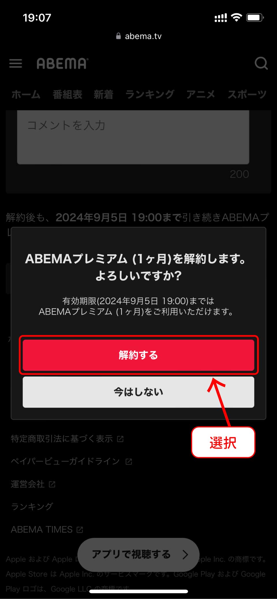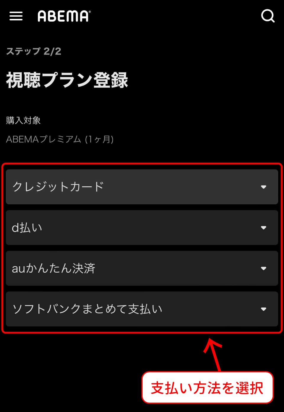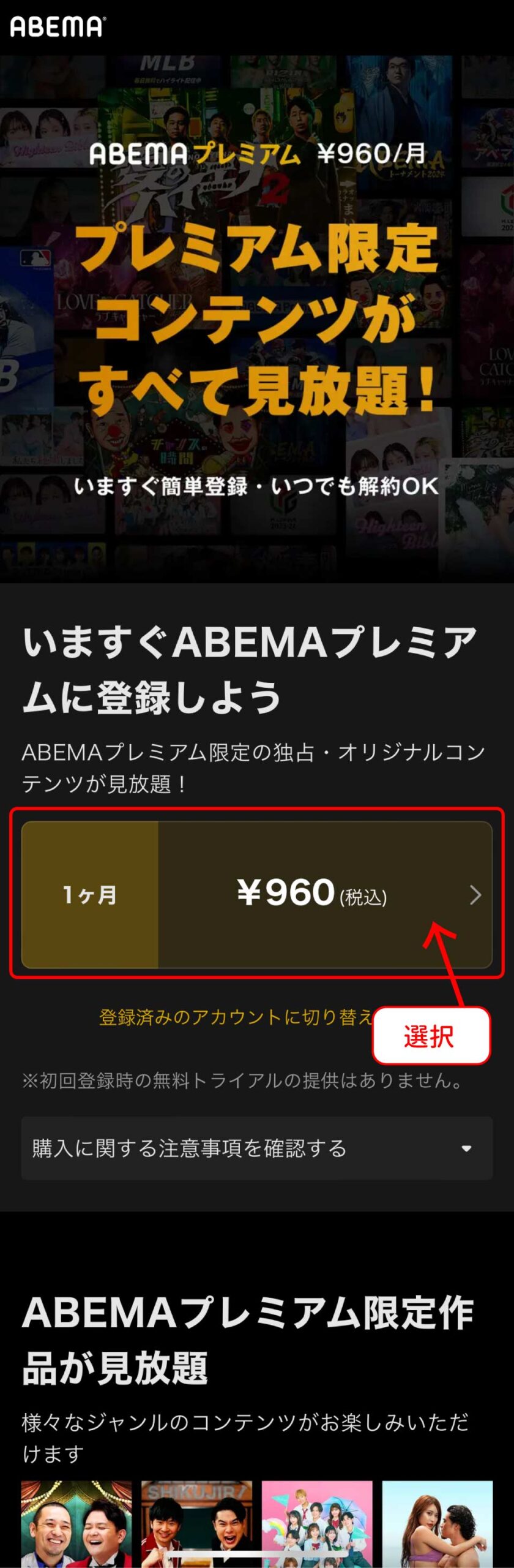 - ABEMAプレミアムトップ画面の「1ヶ月:¥960(税込)」を選択してください。