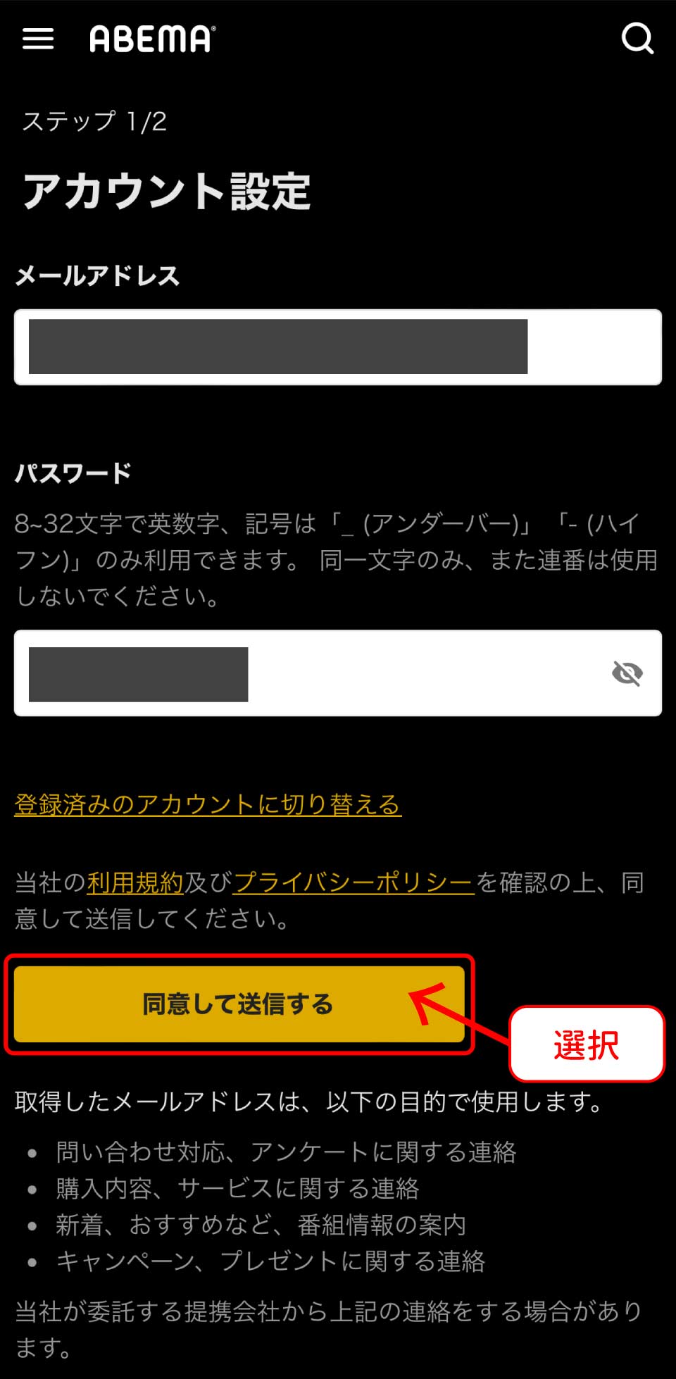 - メールアドレス・パスワードを入力し、利用規約、プライバシーポリシーを確認の上、問題なければ「同意して送信」を選択してください。