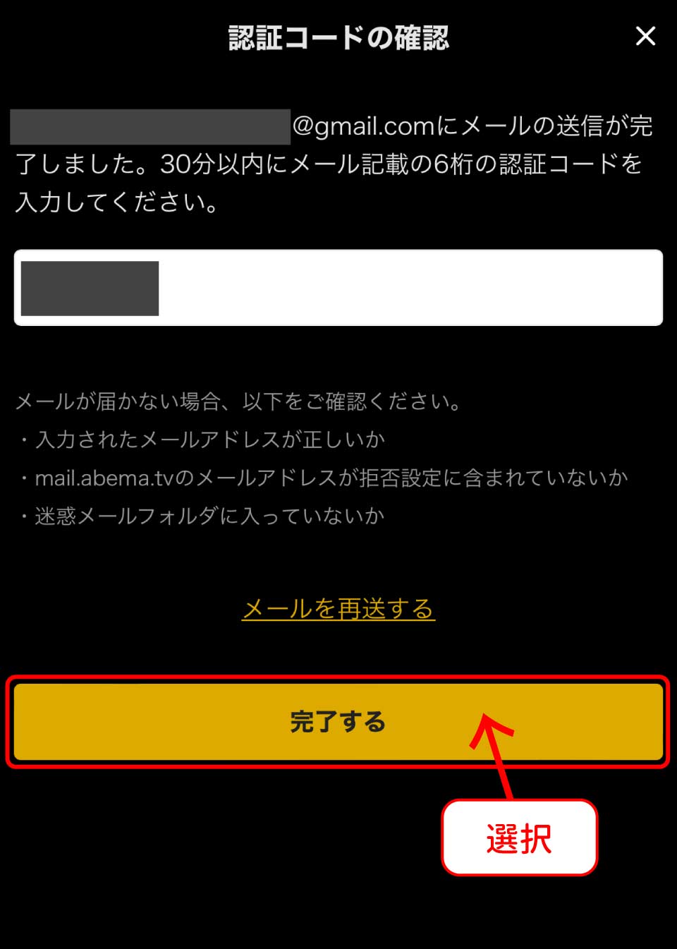 - 登録したメールアドレスに届いた認証コードを入力し、「完了する」を選択してください。