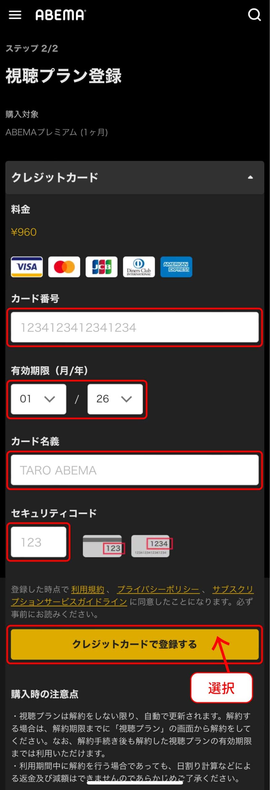 カード番号・有効期限・カード名義・セキュリティコードを入力し、「クレジットカードで登録」を選択してください。