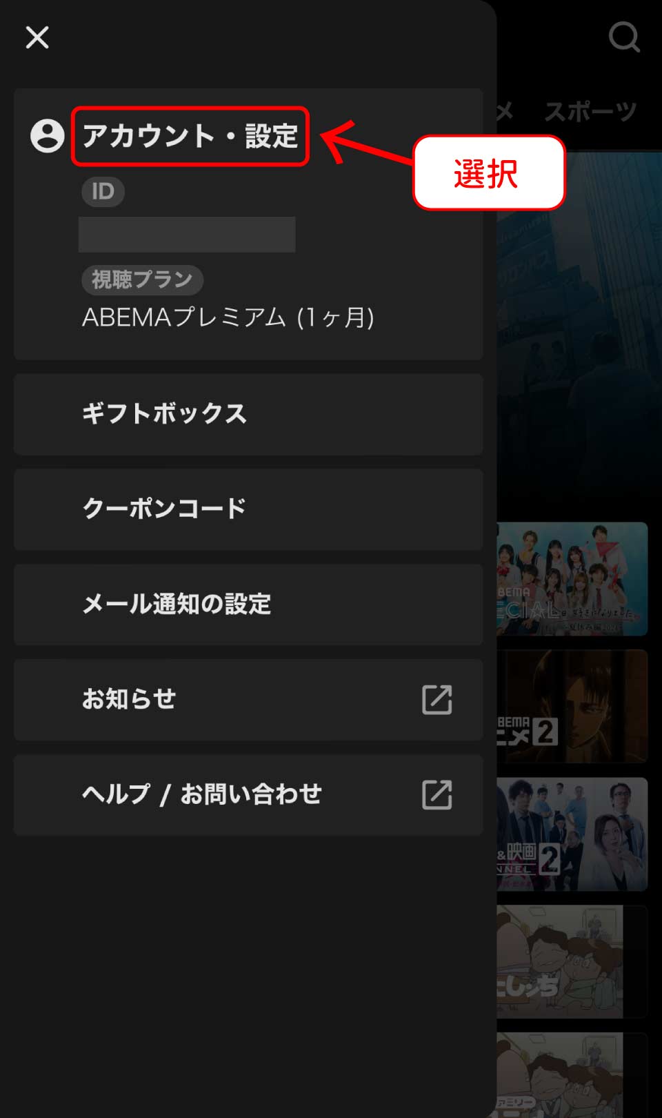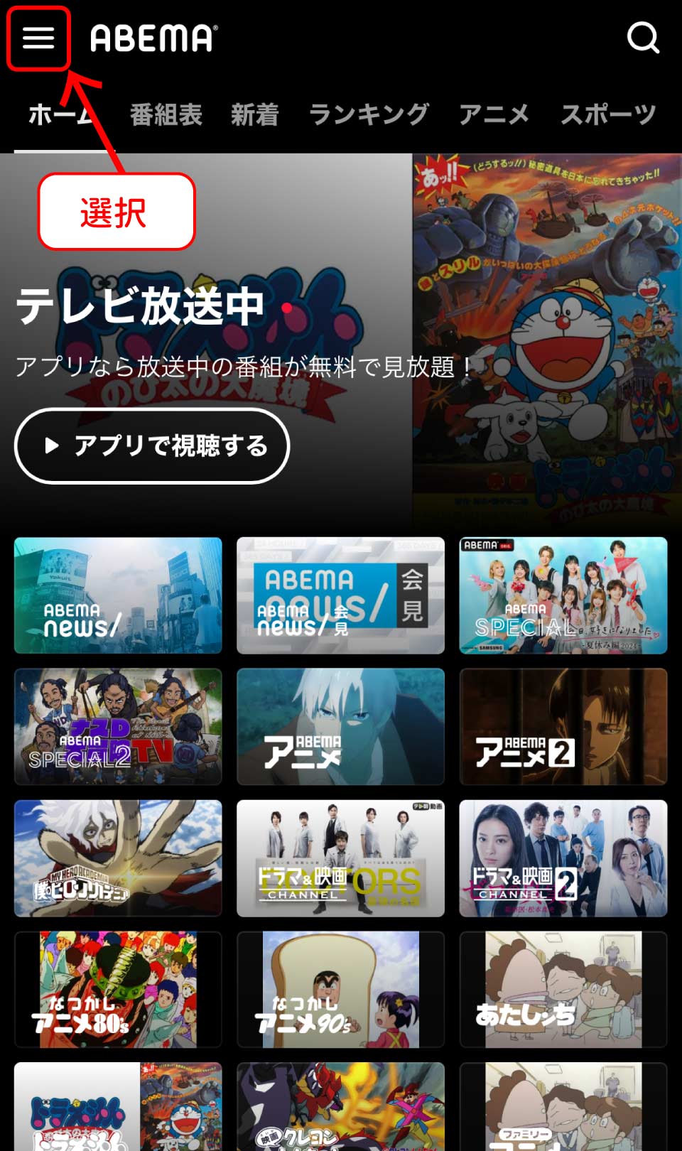 - ABEMAプレミアムのTOP画面左上の三本線マーク(ハンバーガーメニュー)を選択します。