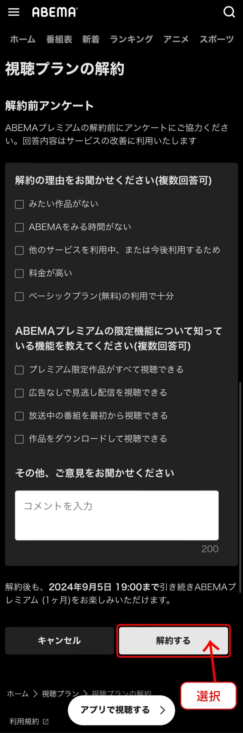 - 必要に応じアンケートに回答し、「解約する」のボタンを押します。