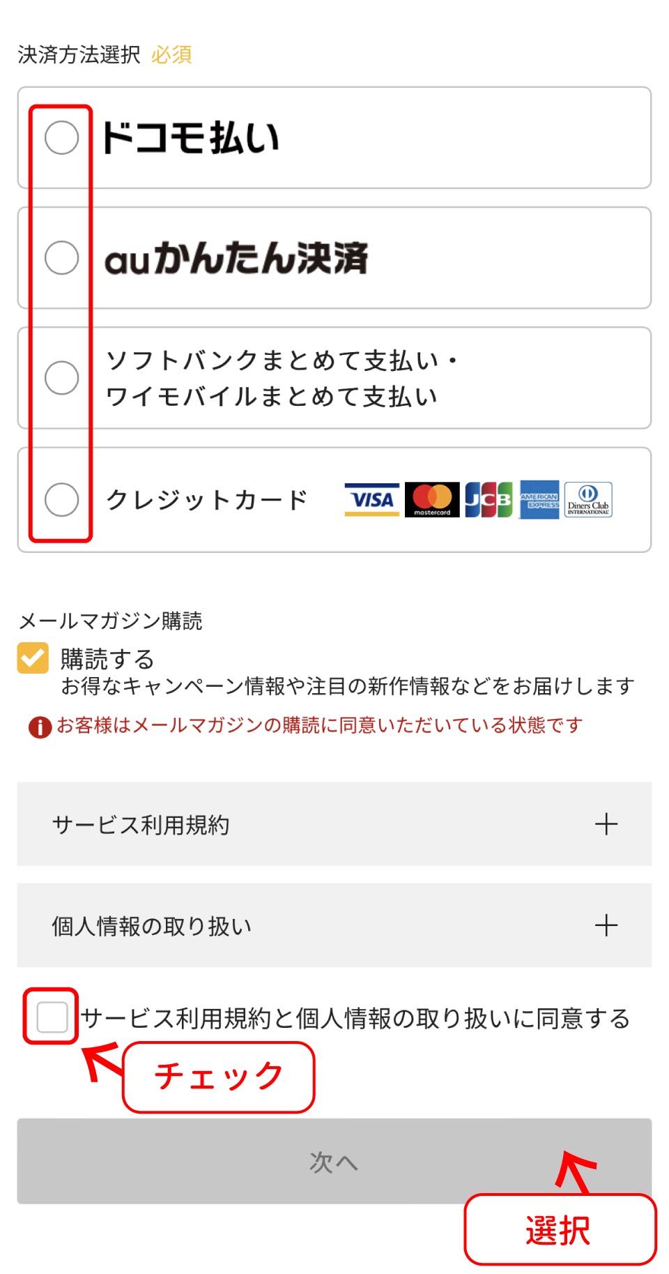 - 決済方法を選択し、サービス利用規約と個人情報の取扱いに同意するにチェックを入れ、「次へ」をタップ
