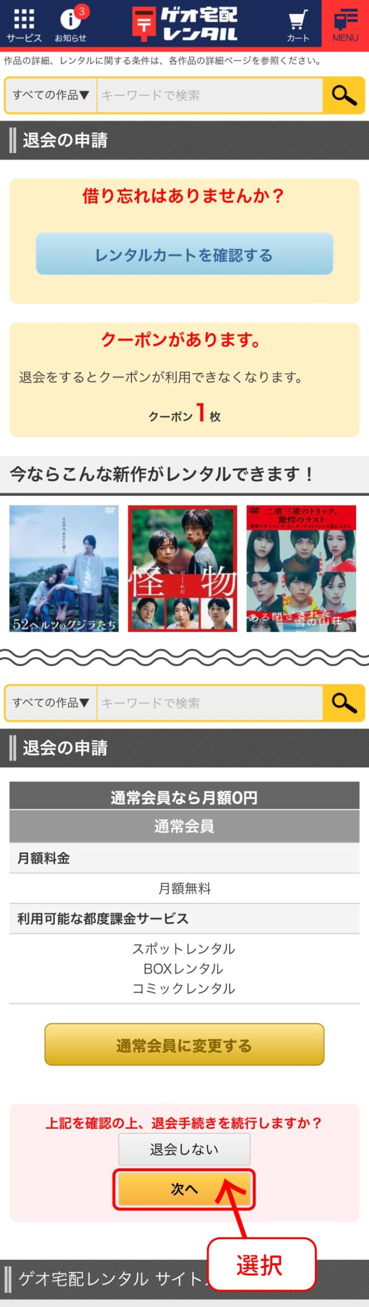 - 退会の申請ページへ遷移したら、ページ下部まで画面をスクロールし、「次へ」のボタンを押します。