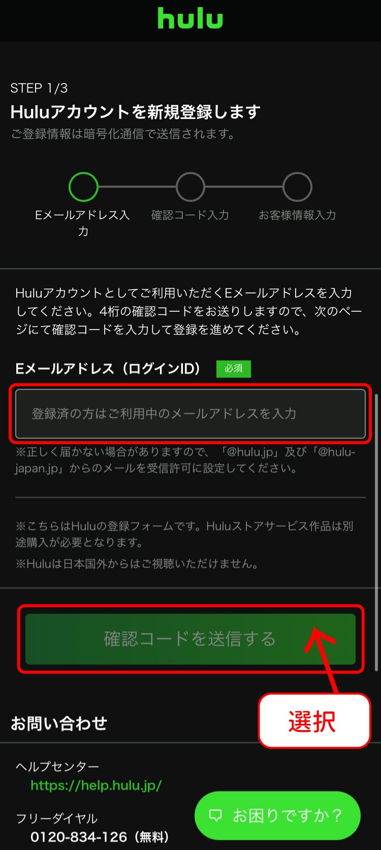 - Eメールアドレスを入力し、「確認コードを送信する」を選択してください。