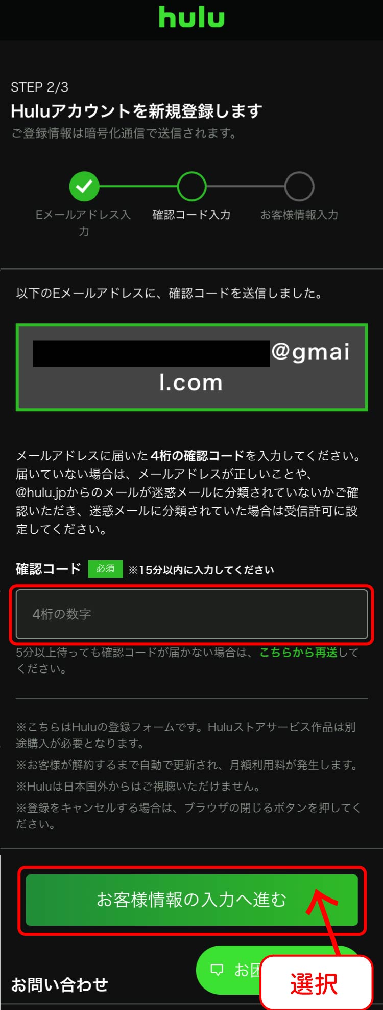 - 入力したメールアドレスに届いた4桁の確認コードを入力し、「お客様情報入力へ進む」を選択してください。