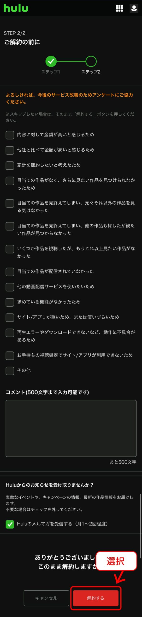 - まだ解約は完了していません。「解約ステップを進める」のボタンが出てくるまでスクロールしてください。