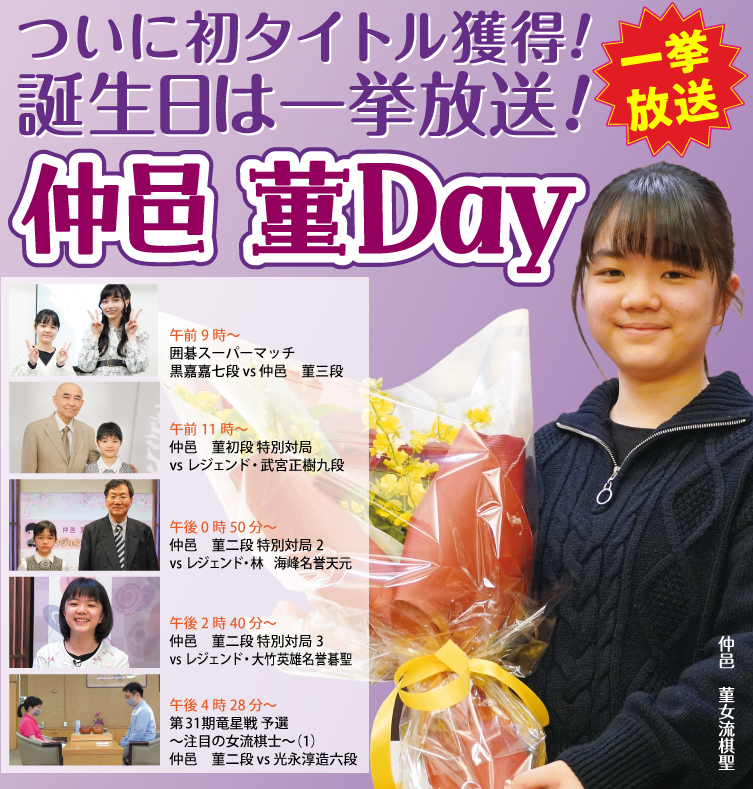 最年少で女流棋聖のタイトルを獲得した仲邑 菫女流棋聖の出演する番組を、誕生日に一挙放送! また、3月26日には仲邑 菫女流棋聖の成長と活躍を振り返るドキュメンタリー番組「仲邑 菫 13歳の軌跡 〜夢への第一歩〜」を放送予定。お楽しみに!