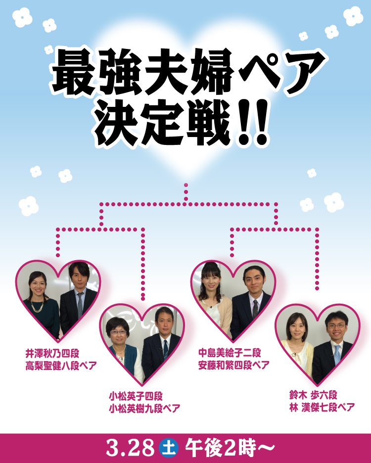 囲碁界で一番相性のいい夫婦はどのペアか!? 今回は4組の夫婦が参戦。1組目は結婚29年目の小松英子四段・小松英樹九段ペア。2組目は結婚7年目の中島美絵子二段・安藤和繁四段ペア。3組目は結婚3年目の井澤秋乃四段・高梨聖健八段ペア。4組目は結婚2年目の鈴木 歩六段・林 漢傑七段ペア。この4組のペアが対局を行い、盤上で最も相性のいい夫婦を決める。果たして優勝はどの夫婦か? さらに、出演者の私生活など棋士のプライベートが伺えるフリートークも。いい夫婦とは何か? おしどり夫婦が熱く語る。| 放送日 |