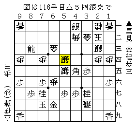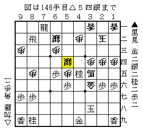 先手三間飛車vs後手銀冠の対抗形から、里見女流王将が千日手模様を打開して迎えた局面。