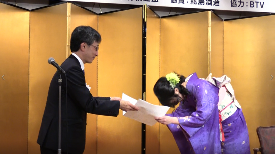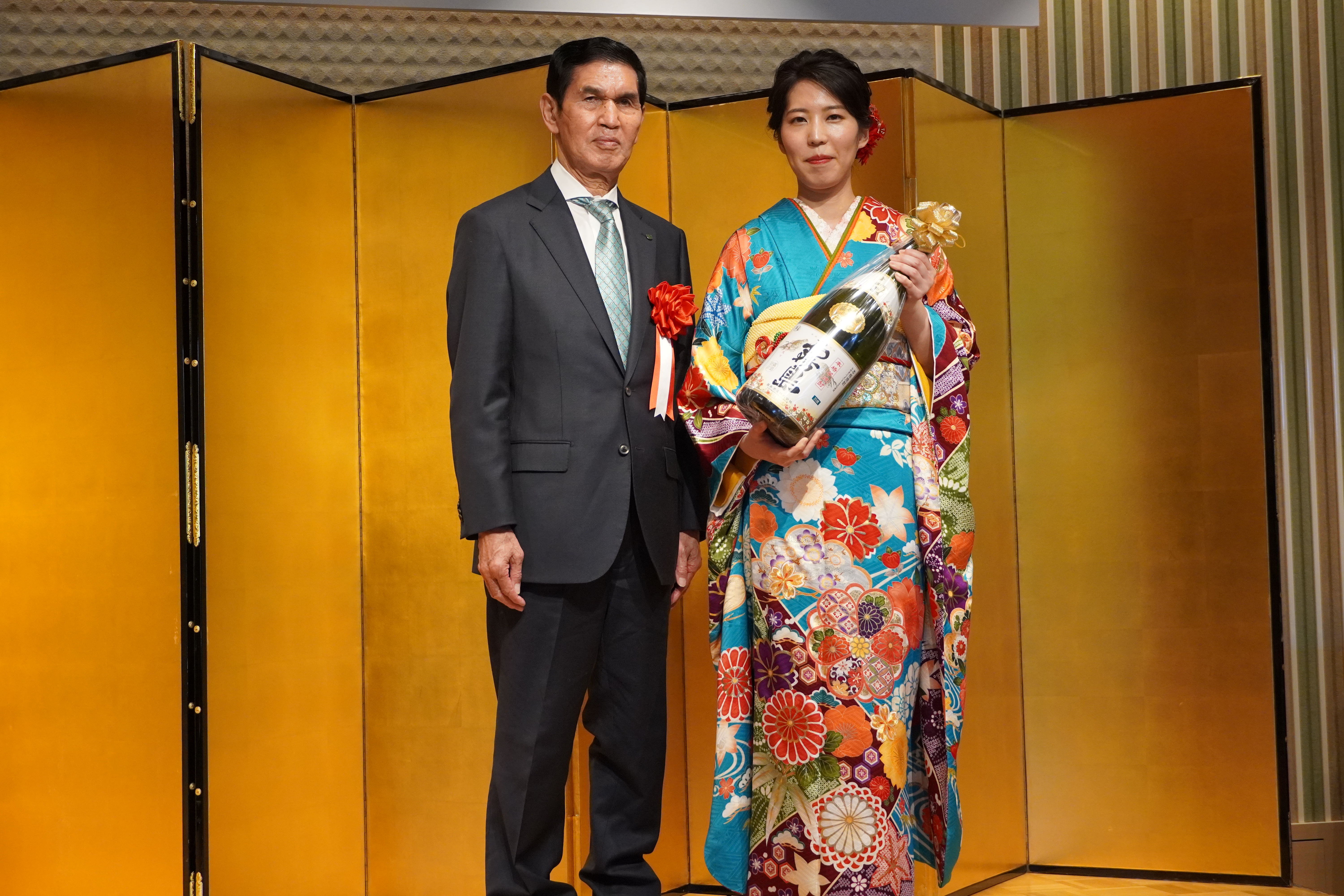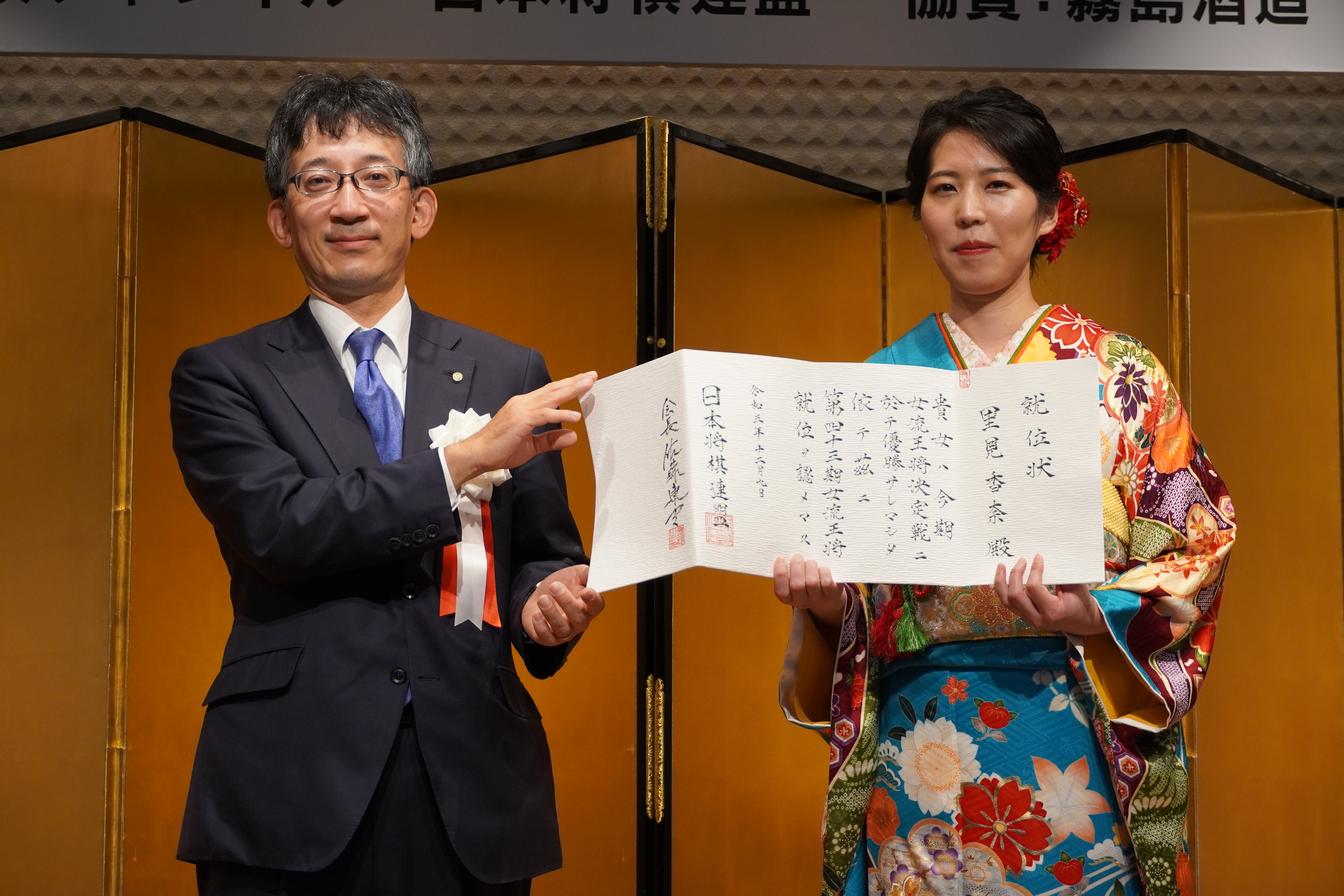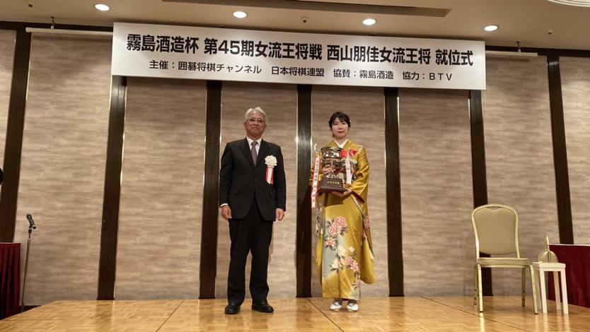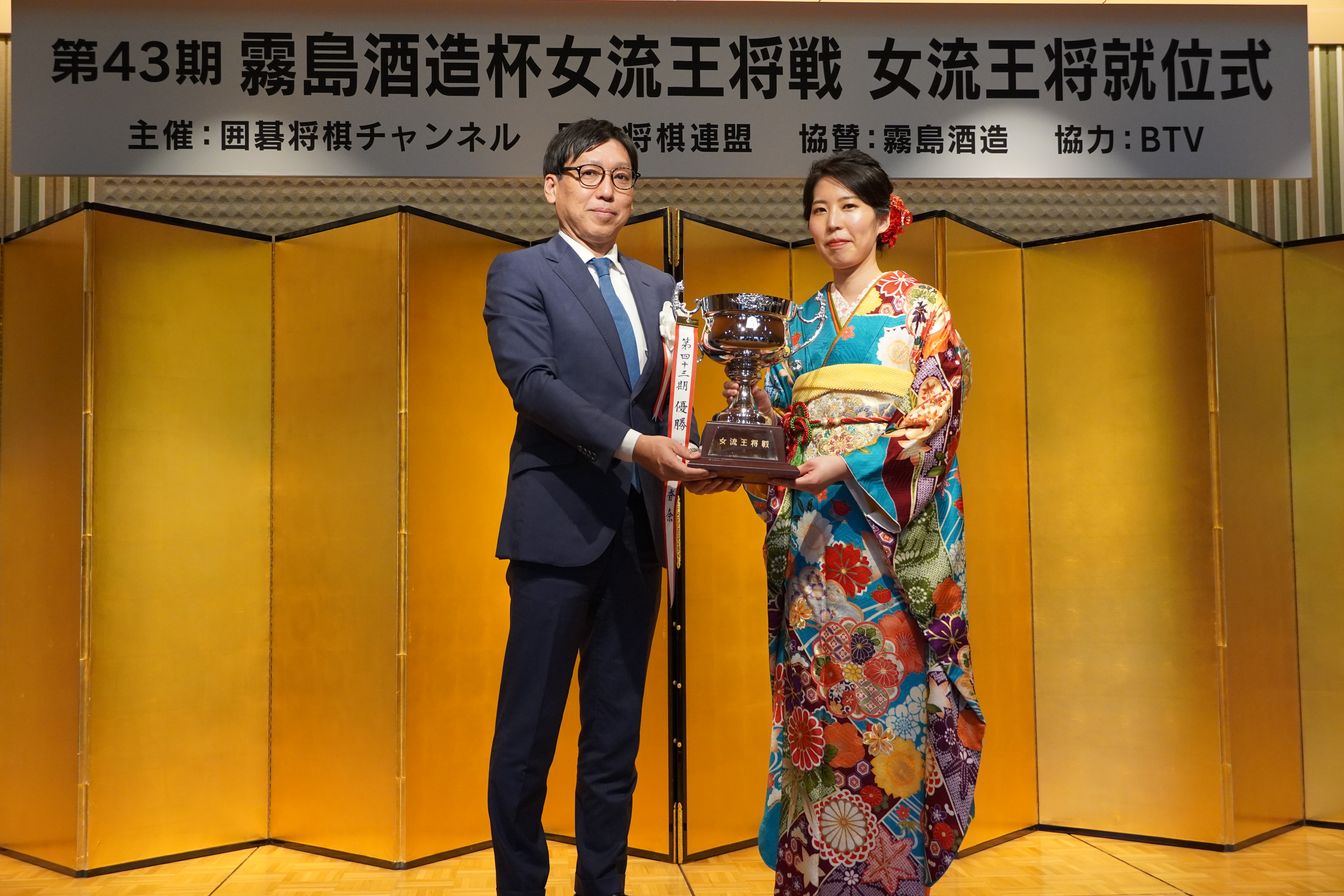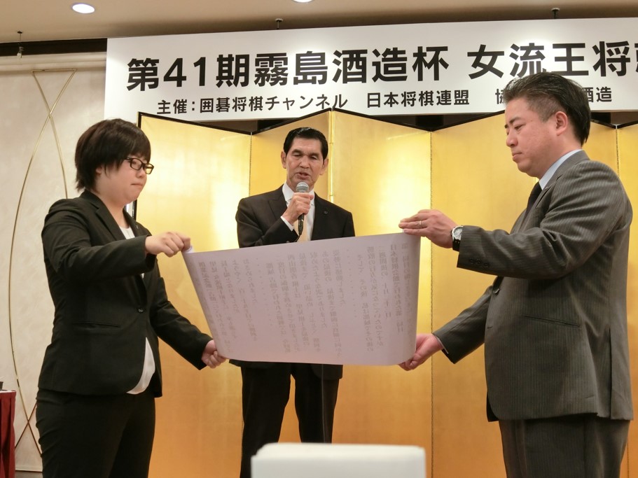 本棋戦を主催する囲碁将棋チャンネル 代表取締役社長の倉元健児よりトロフィーの授与