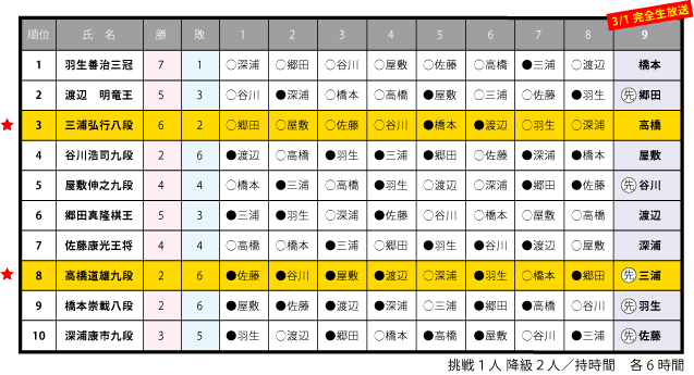 三浦は、羽生が敗れて自身が勝てば、名人挑戦権を懸けたプレーオフへと進める。リーグの直接対決では羽生のA級順位戦連勝を21で止める見事な勝利を上げているだけに、ここは何としても勝ちたいところ。一方の高橋は、勝ってなおかつ谷川・深浦のどちらかが敗れないと残留できないという厳しい状況にある。