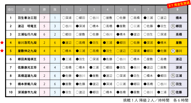 果たして屋敷の先手番が決まっているこの最終局、谷川が勝って残留を決め、A級在籍連続記録を32期に伸ばすのか? それとも先手番の利を誰よりも最大限に生かしている屋敷が本局も制するのか!? 谷川にとってかつてないほど大きな意味を持つ戦いの火ぶたが今、切って落とされる!!