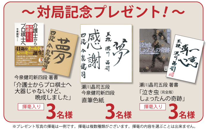 昨年度、将棋界の歴史に新たな1ページが加えられた。2005年の瀬川晶司以来およそ10年ぶりに行われたプロ編入試験で見事合格、四段プロ入りを果たした今泉健司新四段。試験が制度化されてからは初のプロ編入となった。瀬川五段と今泉新四段、プロ編入制度の確立において両者が果たした役割は大きい。そこで今回、今泉新四段のプロ編入を祝し、両者による記念対局を実施。4月からデビューとなる今泉新四段としては、本局をこれから歩んでいく棋士人生の第一歩にふさわしいものとしたい。一方、戦後初のプロ編入者である瀬川五段にとっても、同じ道を通ってきた者として、本局は特別な思いの詰まった一局となるだろう。両者の思いが込められた一局は果たしてどのような将棋となるだろうか。| 放送日 | 解説 | 聞き手 |