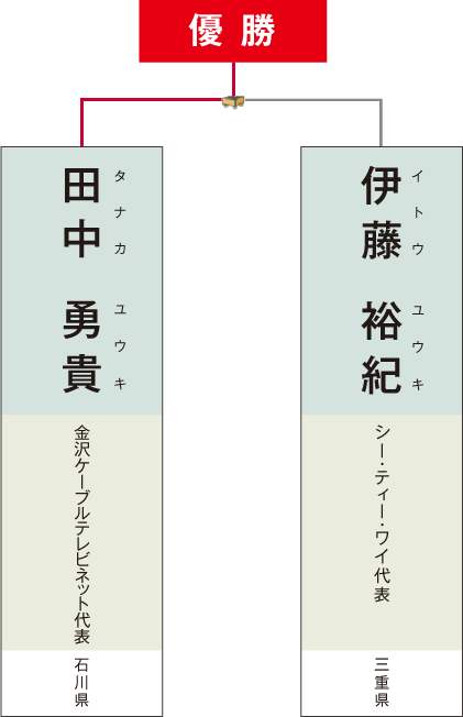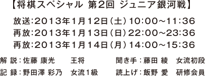 2012年11月23日(祝・金)に東京将棋会館地下1階の将棋スタジオにて「ジュニア銀河戦」の決勝収録対局を実施し、金沢ケーブルテレビネット代表の田中勇貴さんがシー・ティー・ワイ代表の伊藤裕紀さんを下し、見事初優勝を果たしました。