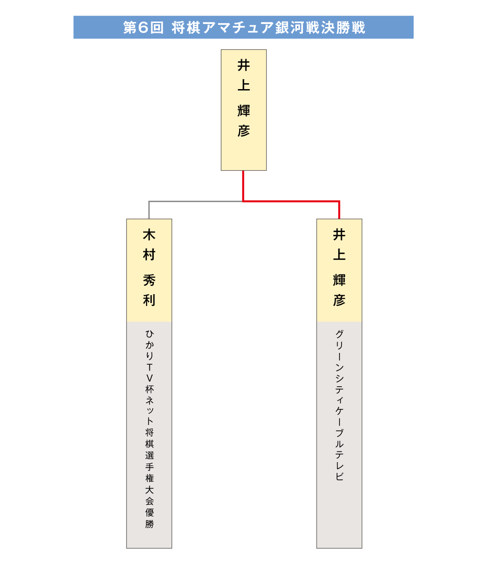 結果は井上輝彦さん(グリーンシティケーブルテレビ)が、木村秀利さん(ひかりTV杯ネット将棋選手権大会優勝)を降して初優勝となりました。なお、井上さんは、優勝特典として、2017年10月から放映される「第26期銀河戦」への出場権を獲得しました。