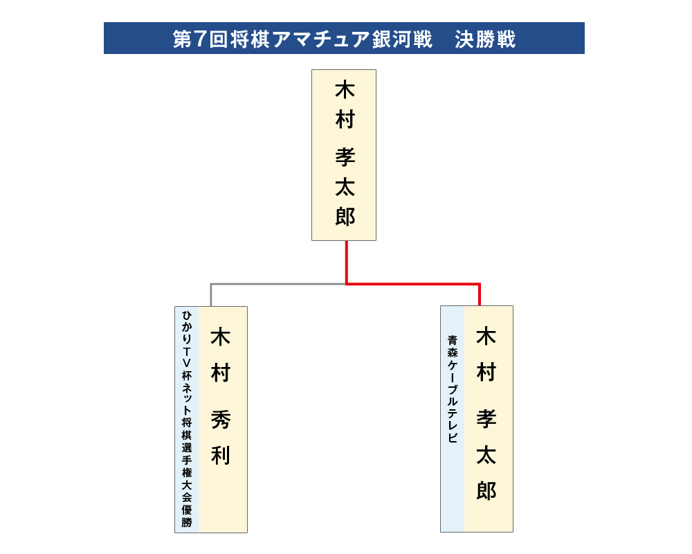 結果は木村孝太郎さん(青森ケーブルテレビ)が、木村秀利さん(ひかりTV杯ネット将棋選手権大会優勝)を降して初優勝となりました。 なお、木村孝太郎さんは、優勝特典として、2018年10月から放映される「第27期銀河戦」への出場権を獲得しました。
