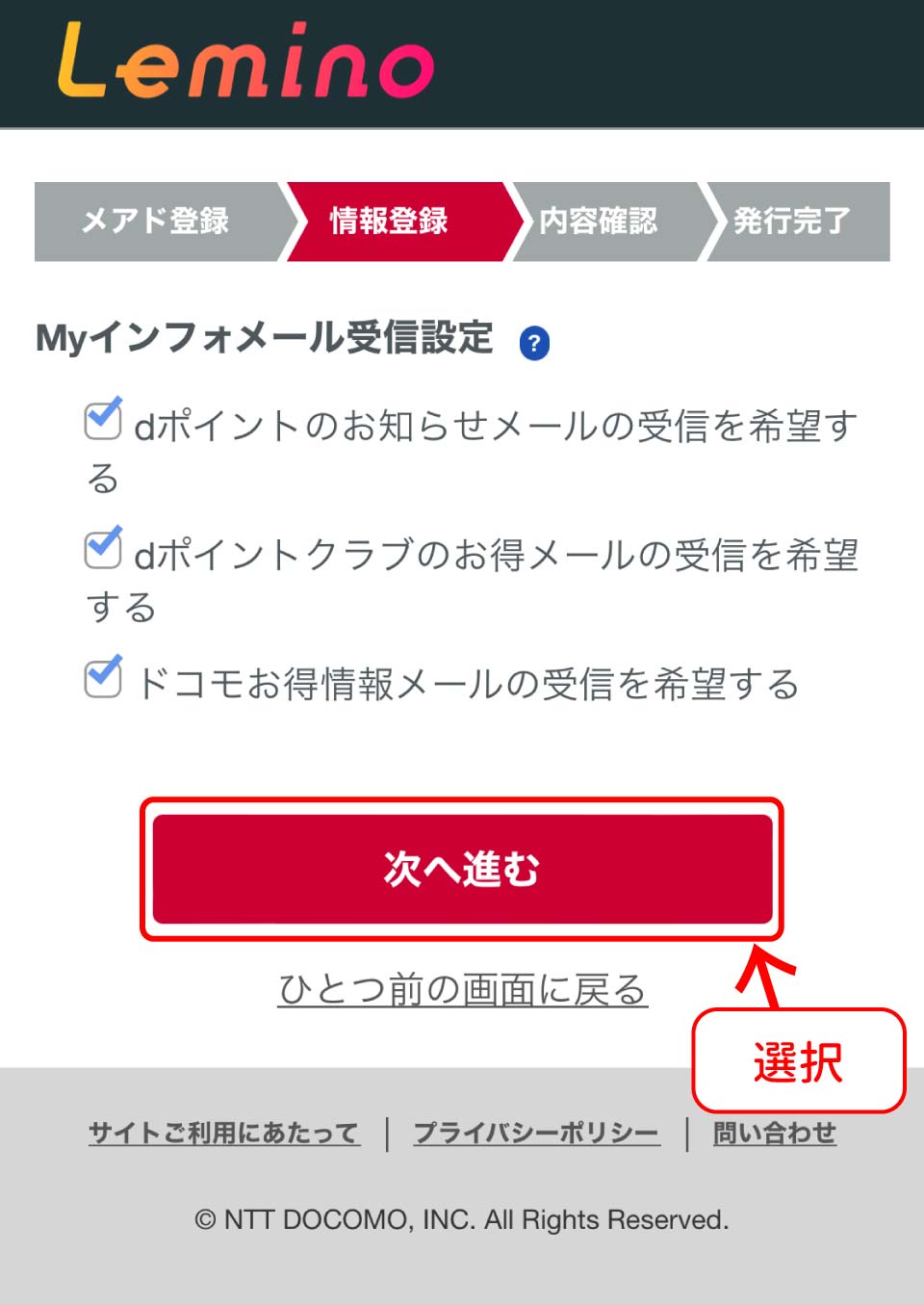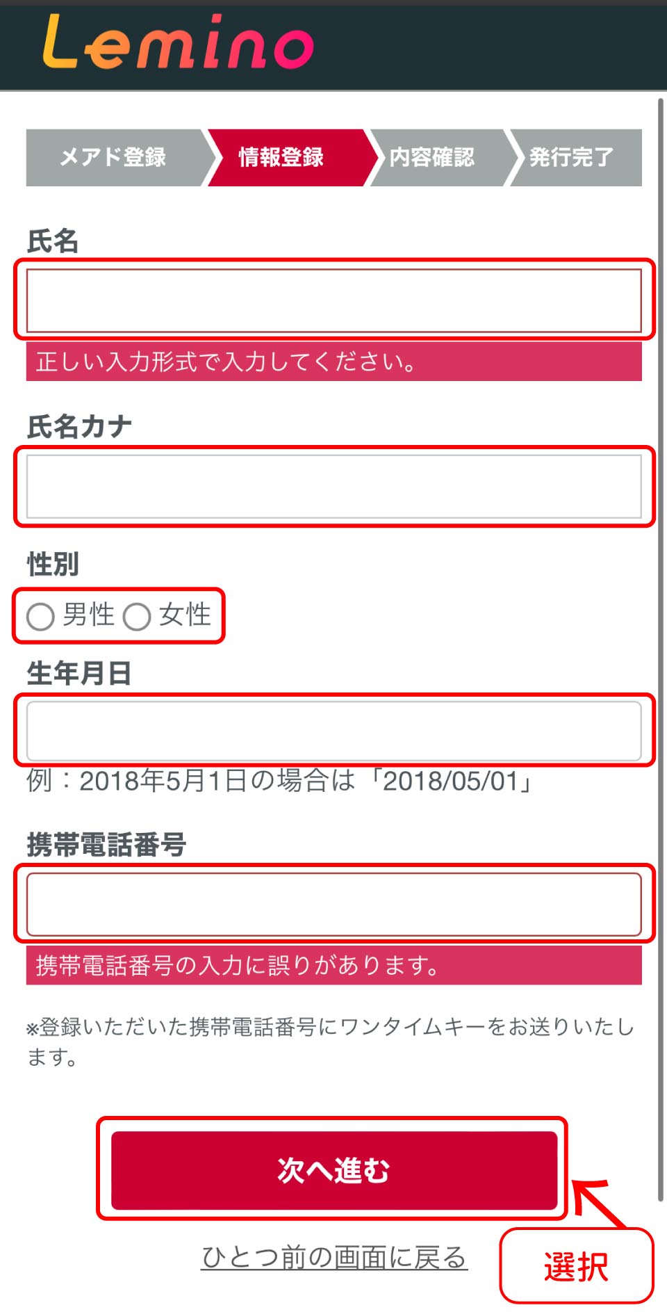 9. 「氏名」「氏名カナ」「性別」「生年月日」「携帯電話番号」を入力し、「次へ進む」を選択