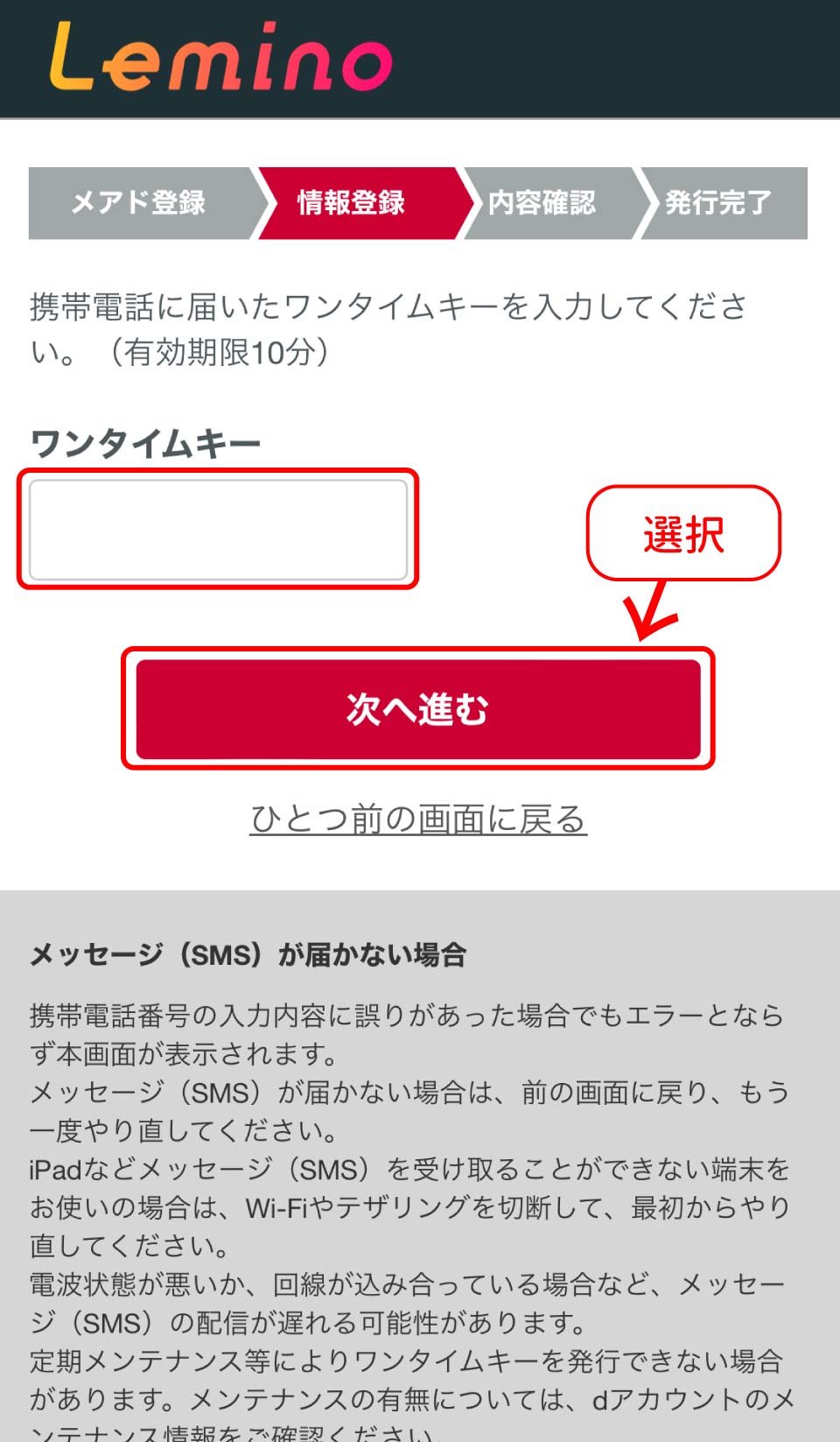 10. 携帯電話に届いた「ワンタイムキー」を入力し、「次へ進む」を選択