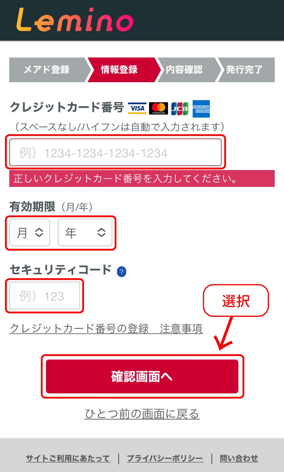 11. 「クレジットカード番号」「有効期限」「セキュリティコード」を入力し、「確認画面へ」を選択