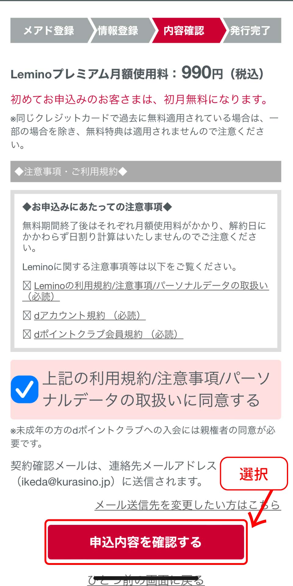 13. 「上記の利用規約/注意事項/パーソナルデータの取り扱いに同意する」にチェックを入れ、「申込内容を確認する」を選択