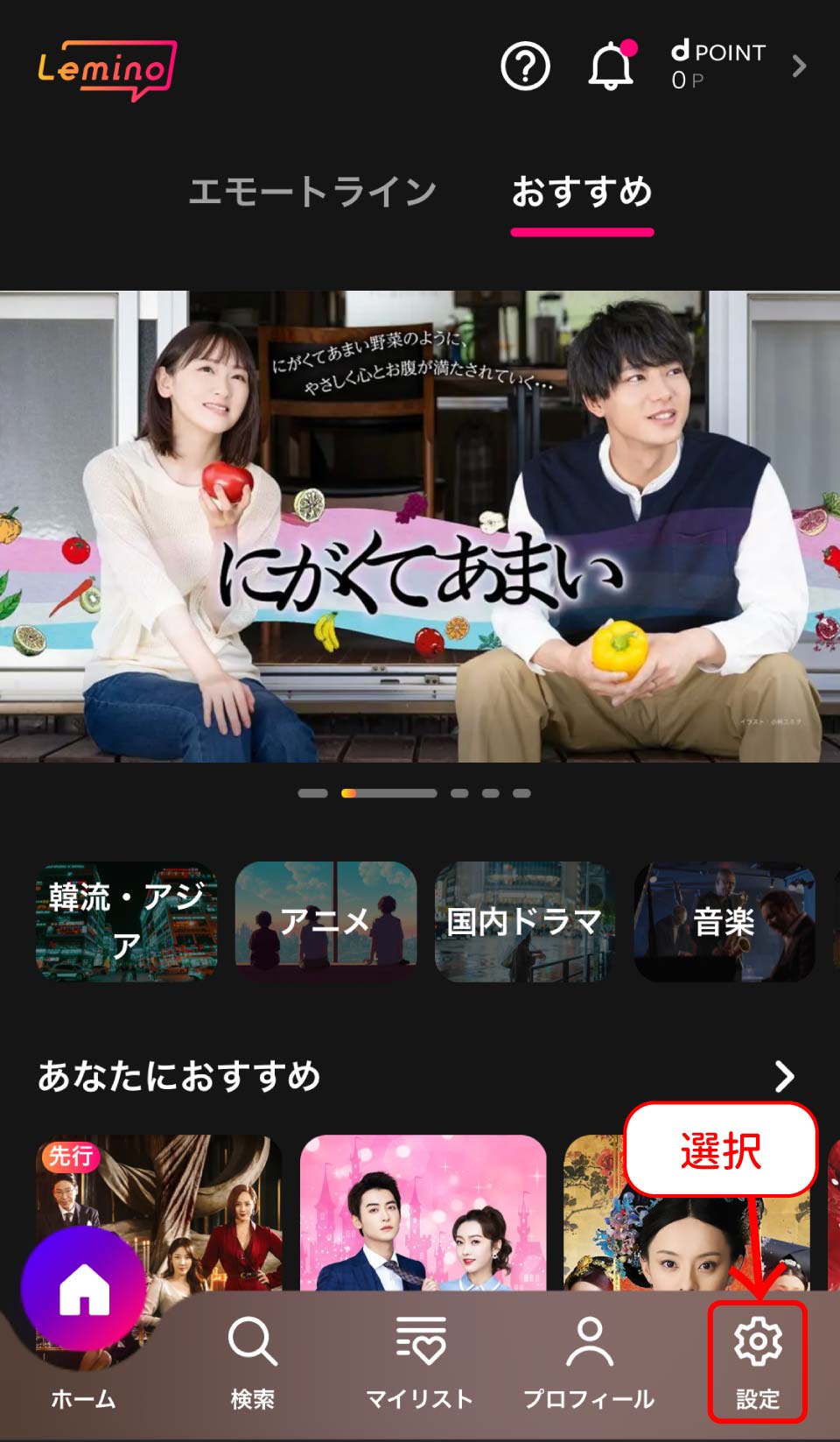 1. Leminoの公式サイト、ページ下の「設定」を選択