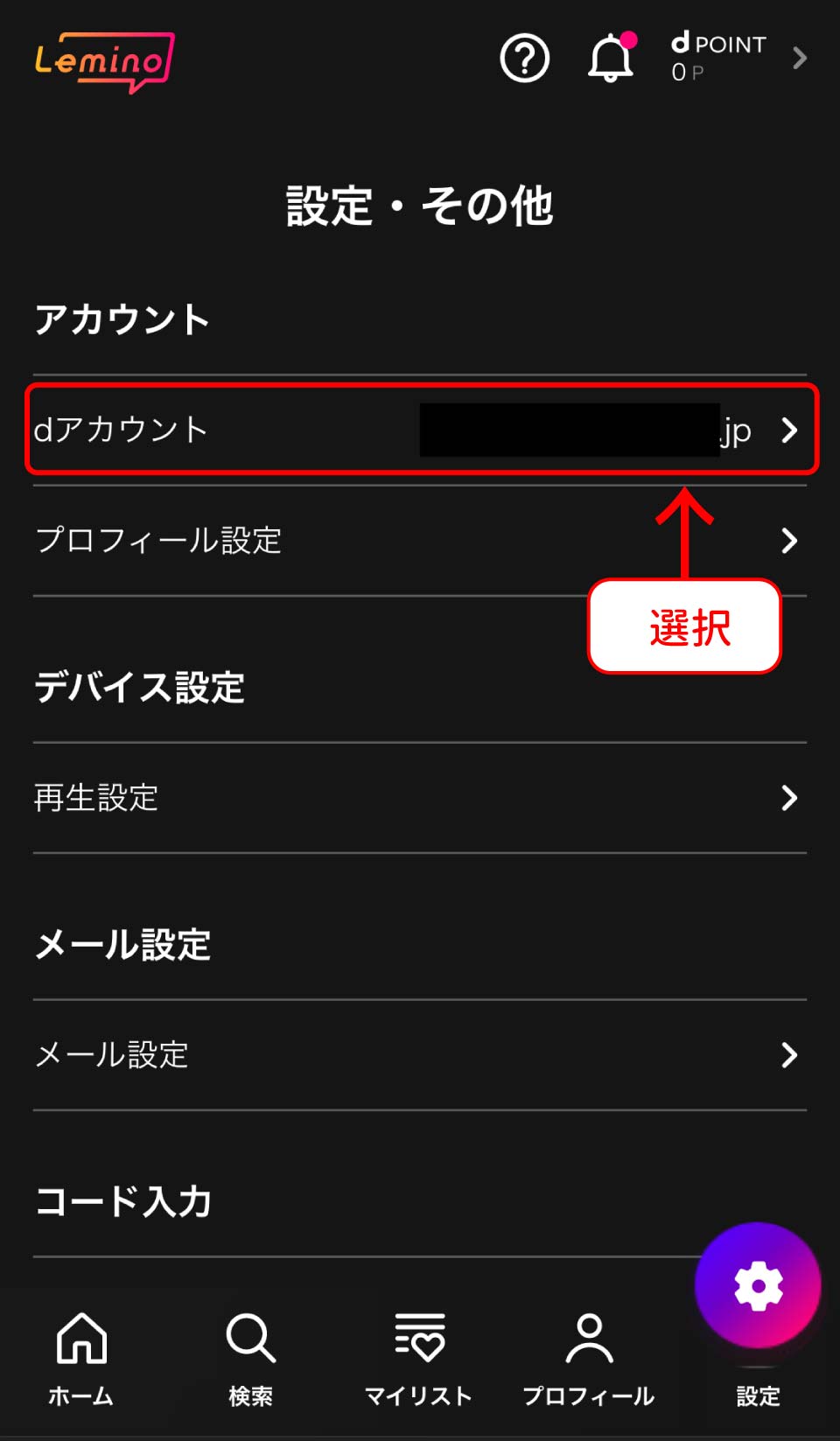 2. 設定・その他から「dアカウント」を選択し、次のページの「Leminoプレミアムの解約」をクリック