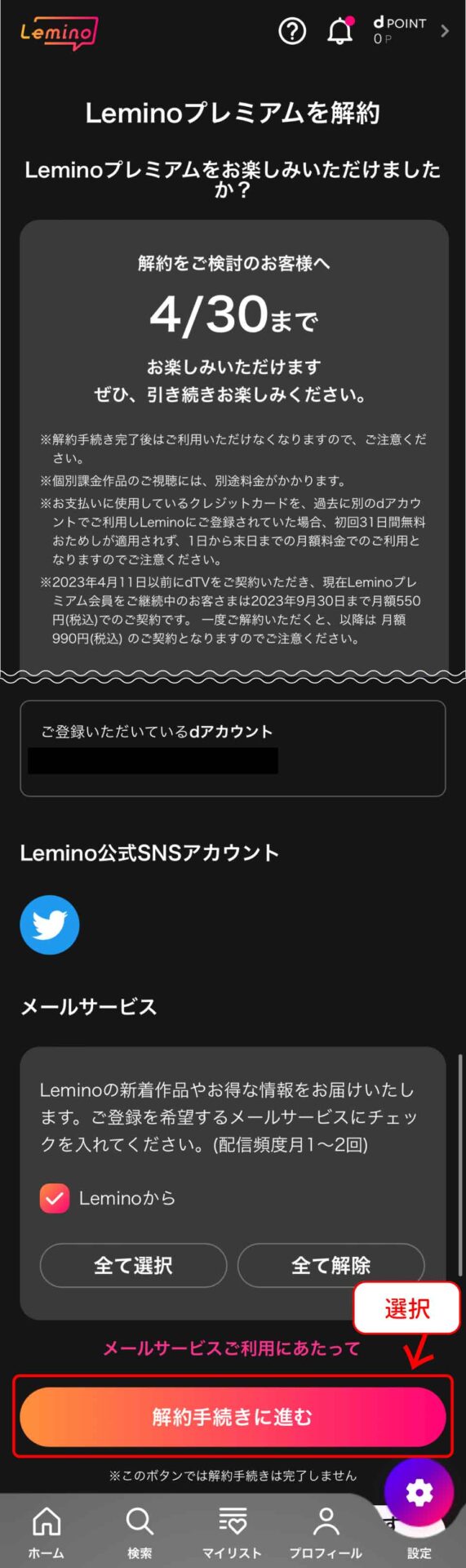 3. Leminoプレミアムを解約が表示されるので、注意事項などを確認しながら下までスクロールし、「解約手続きに進む」を選択