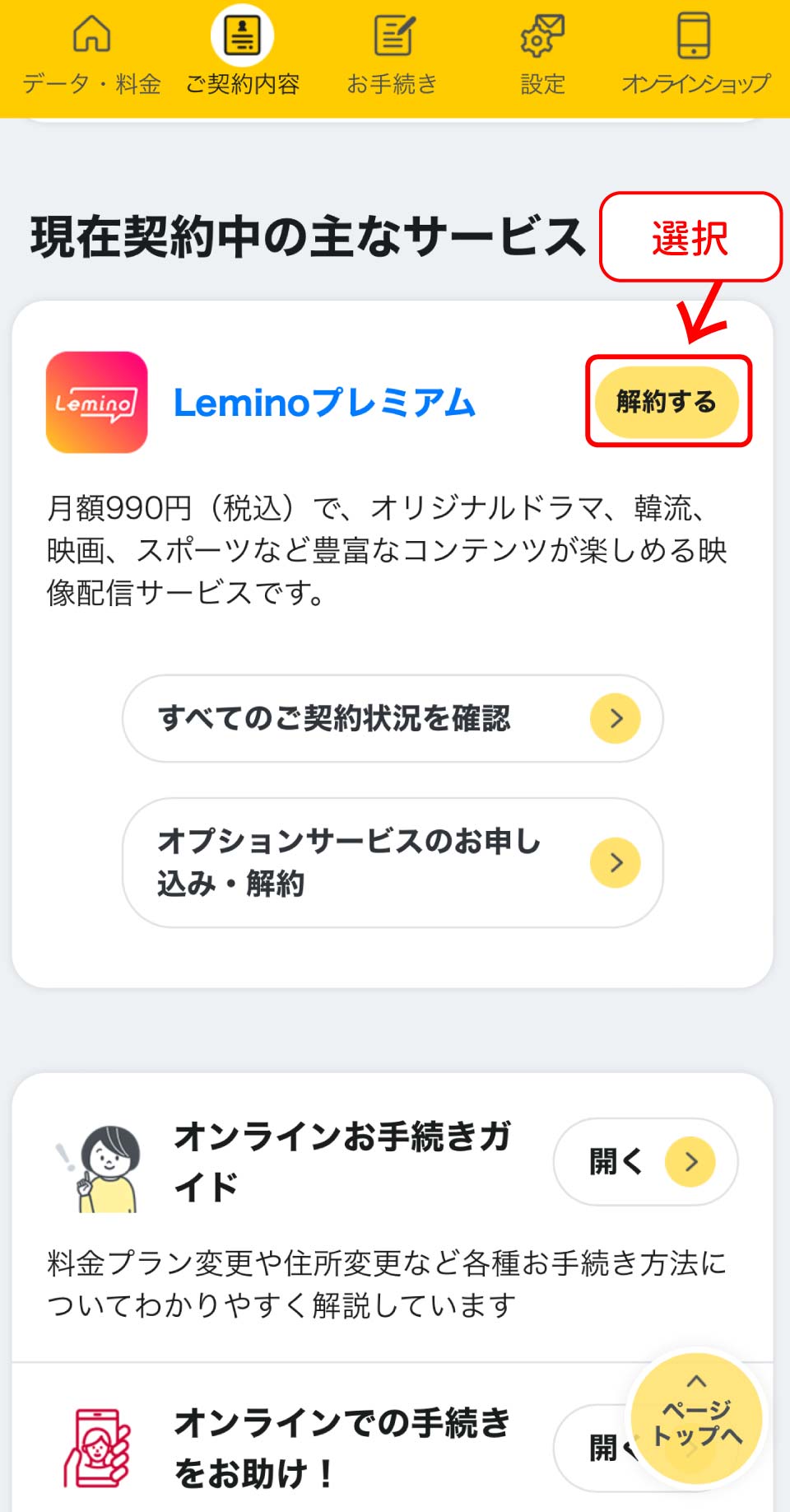 5. 「現在契約中の主なサービス」のLeminoプレミアム「解約する」を選択