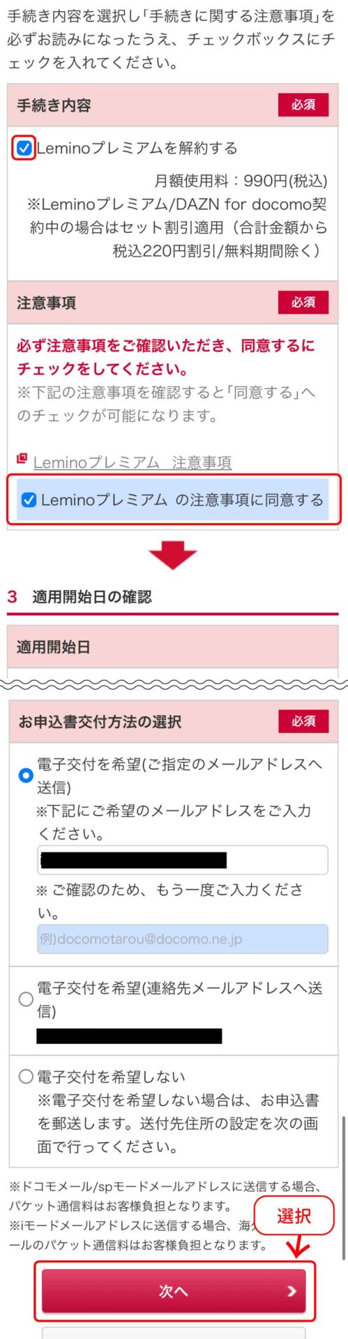 6. 「Leminoプレミアムを解約する」にチェックを入れ、「手続きに関する注意事項」を読んだ後、チェックボックスにチェックを入れる