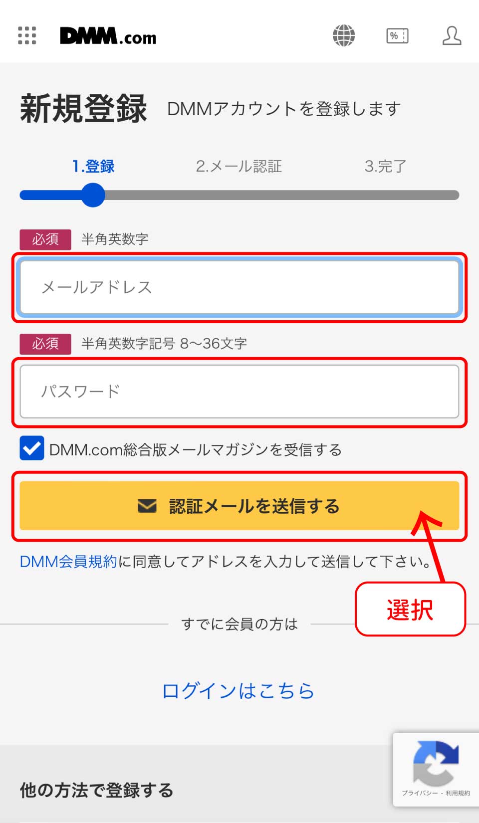 3. 「メールアドレス」「パスワード」を入力し、「認証メールを送信する」を選択してください。