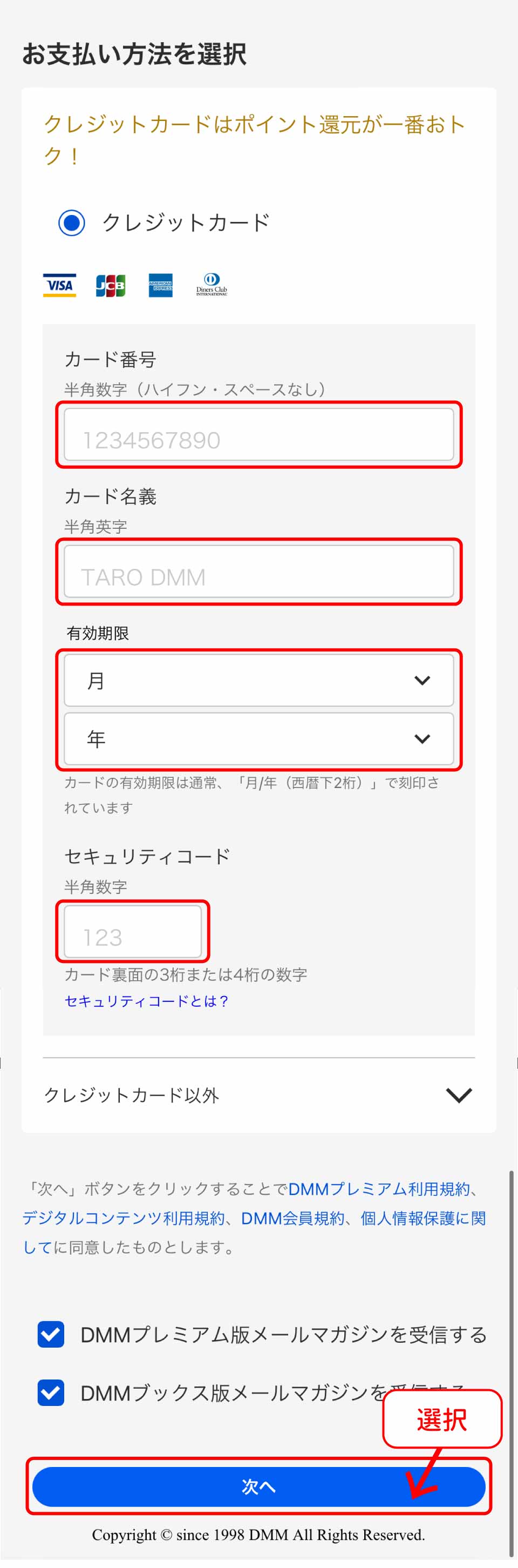クレジットカード番号・カード名義・有効期限・セキュリティコードを入力し、「次へ」を選択してください。