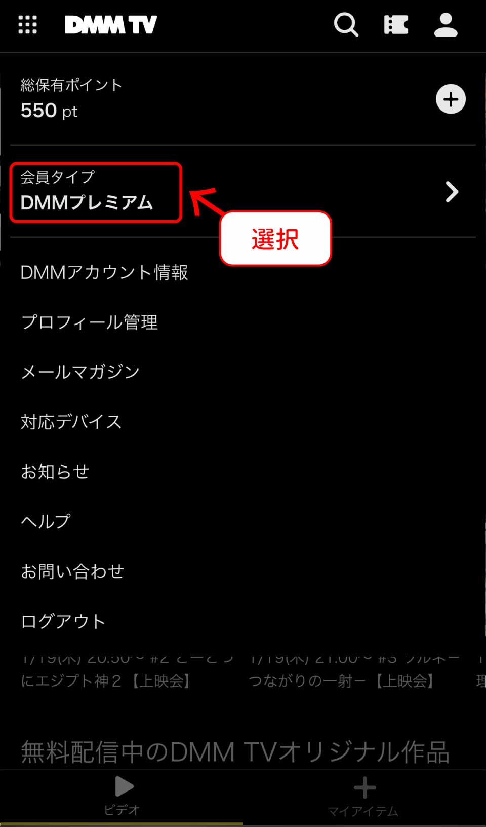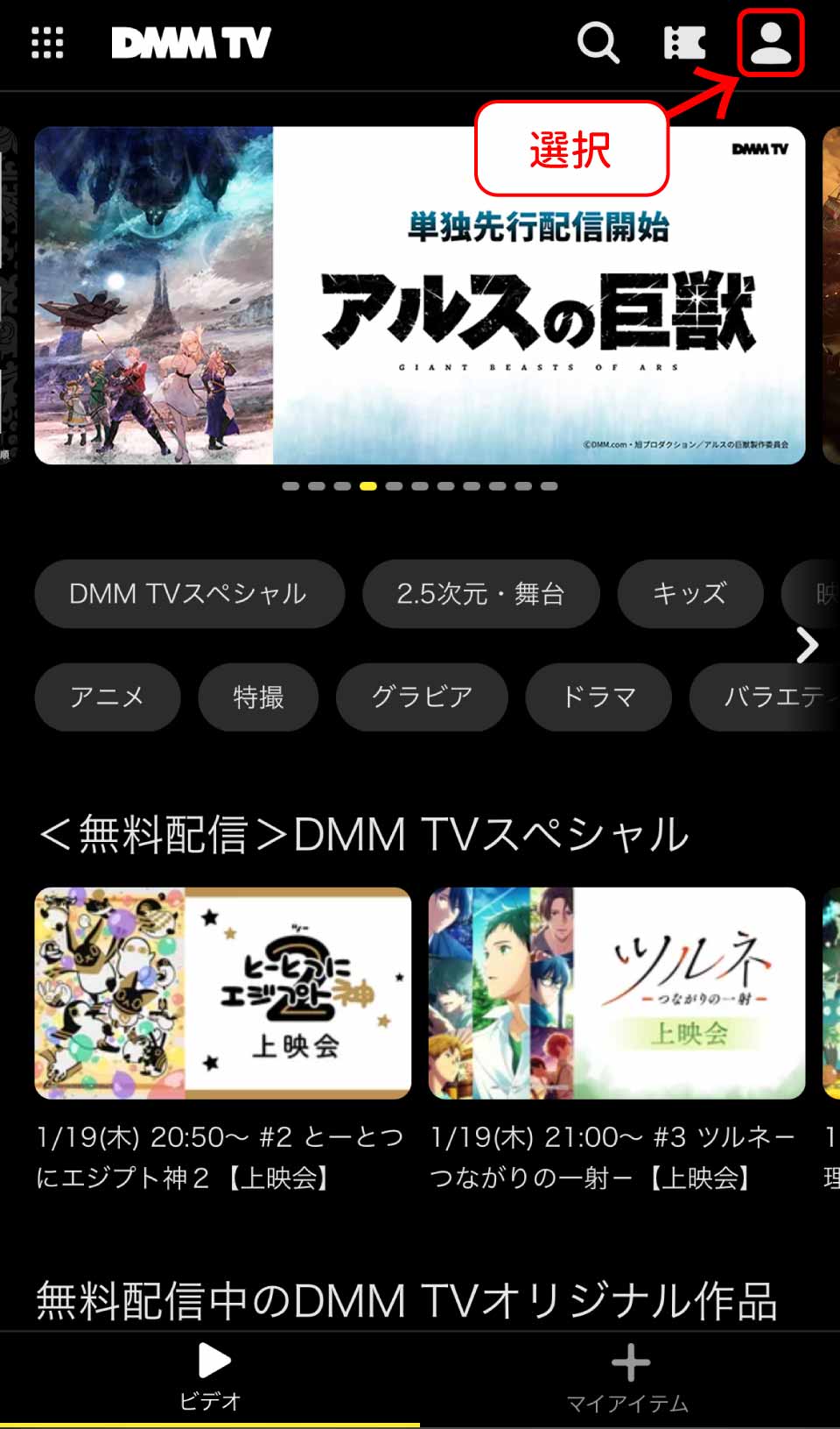 1. DMM TVトップ画面の人型アイコンをクリック。