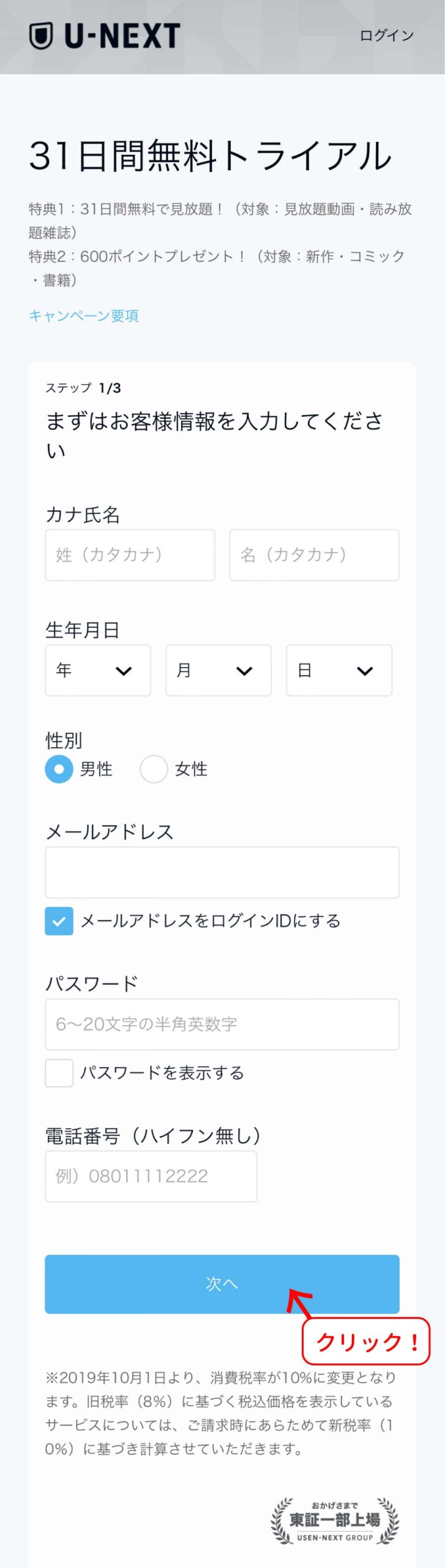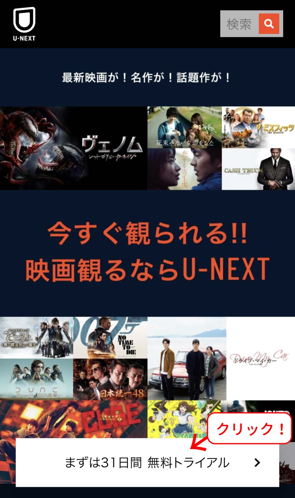 1. U-NEXTトップ画面の「まずは31日間 無料トライアル」を選択してクリックしてください。