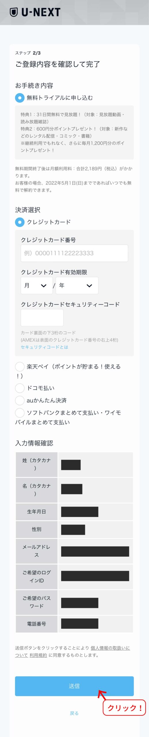 3. 登録内容を確認、月額料金の決済方法を選び「送信」ボタンをクリックしてください。
