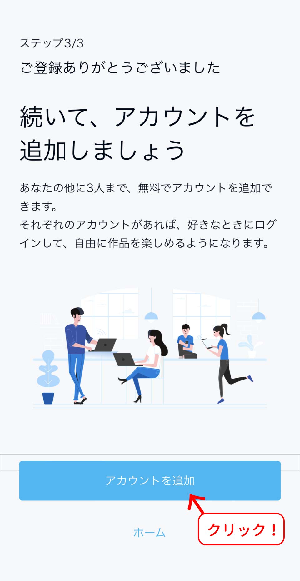 4. これで登録は完了です!続いてアカウントを追加します。無料で本人+3人のアカウントの追加が可能です。
