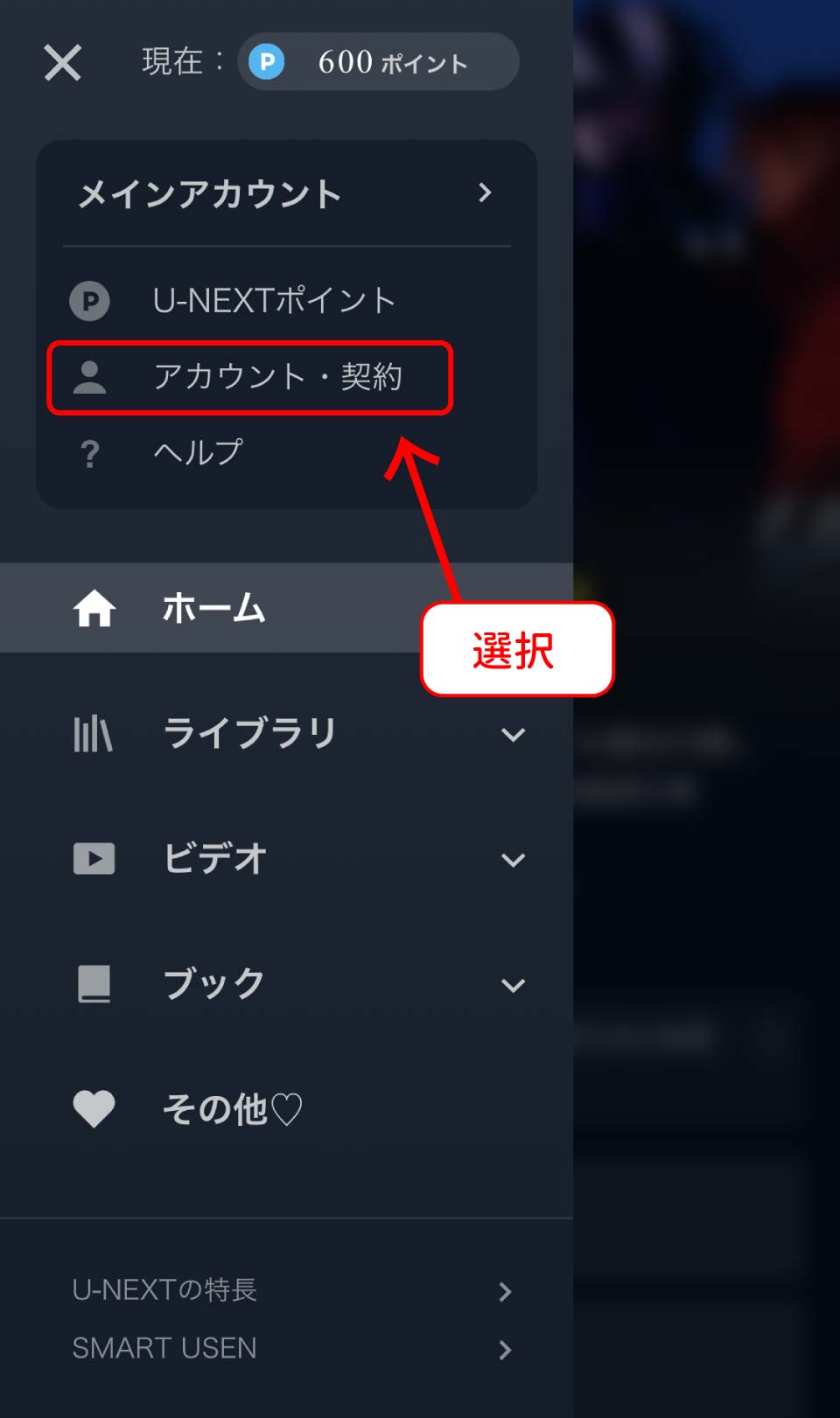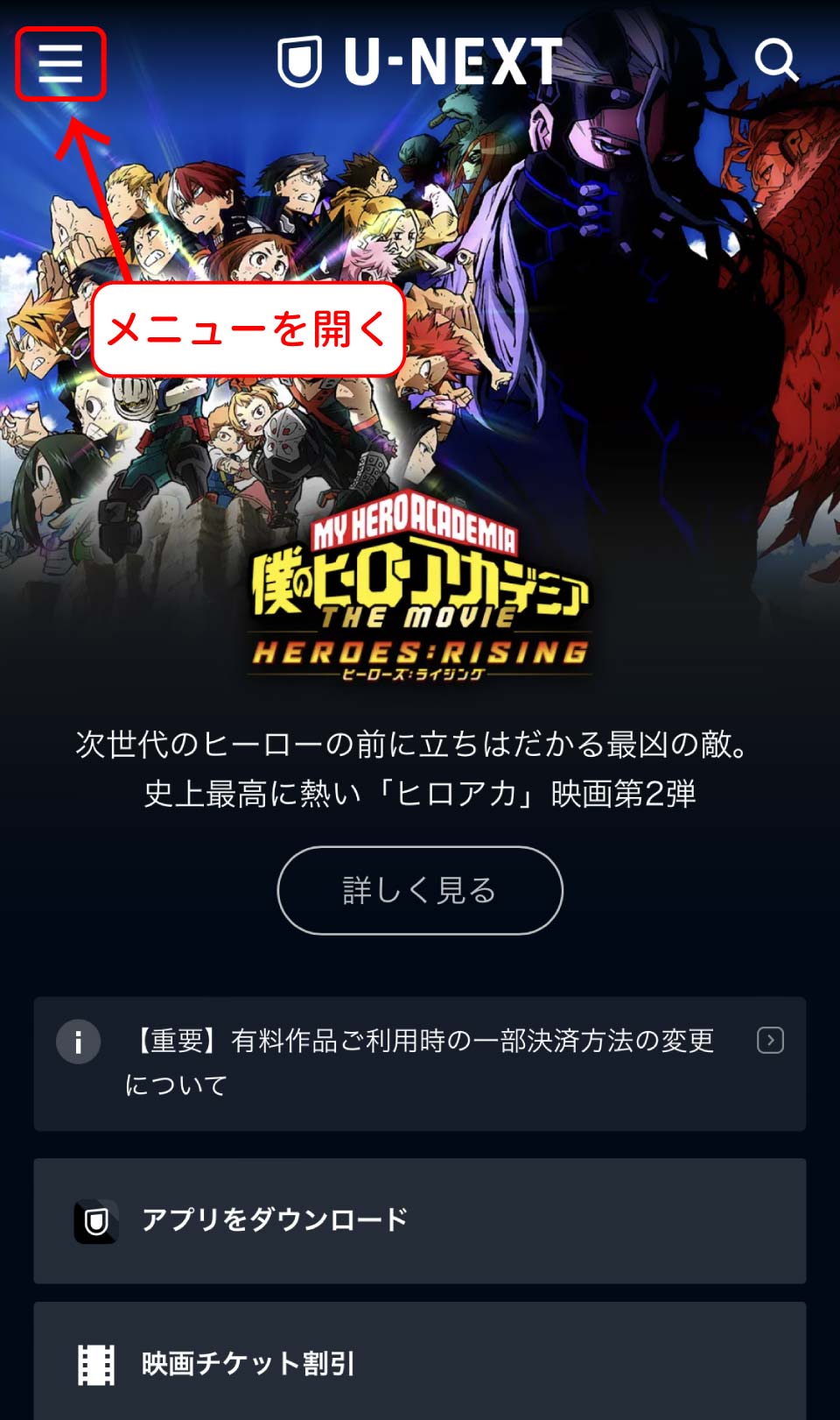1. U-NEXTのトップ画面にある「メニュー」を開いてください。