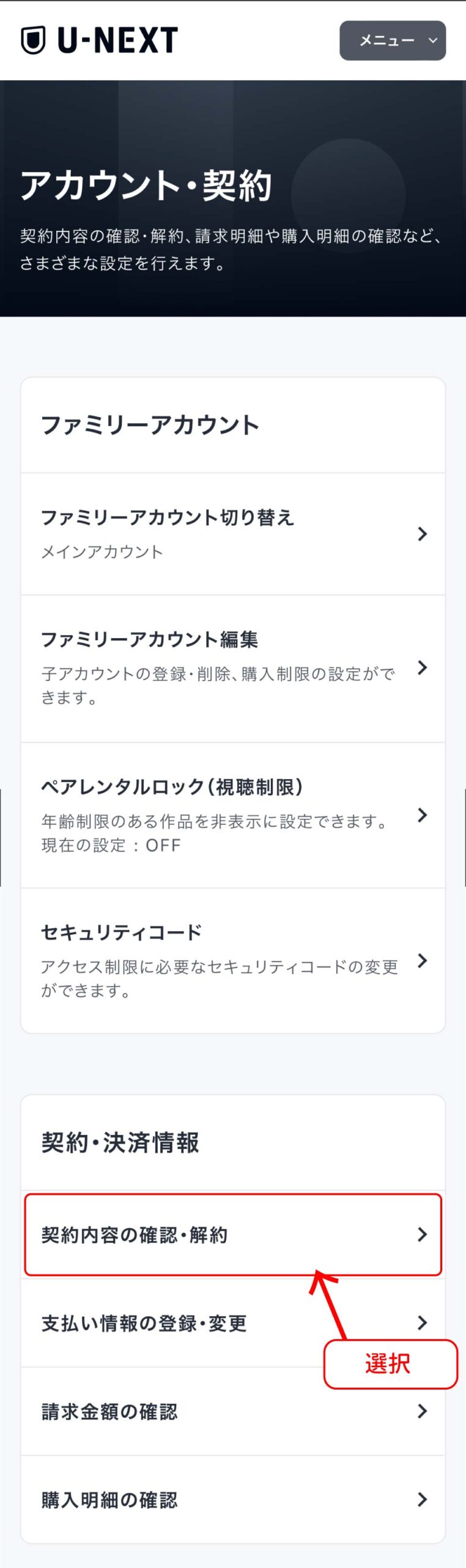 3. 「契約・決済情報」内にある「契約内容の確認・解約」を選択してください。