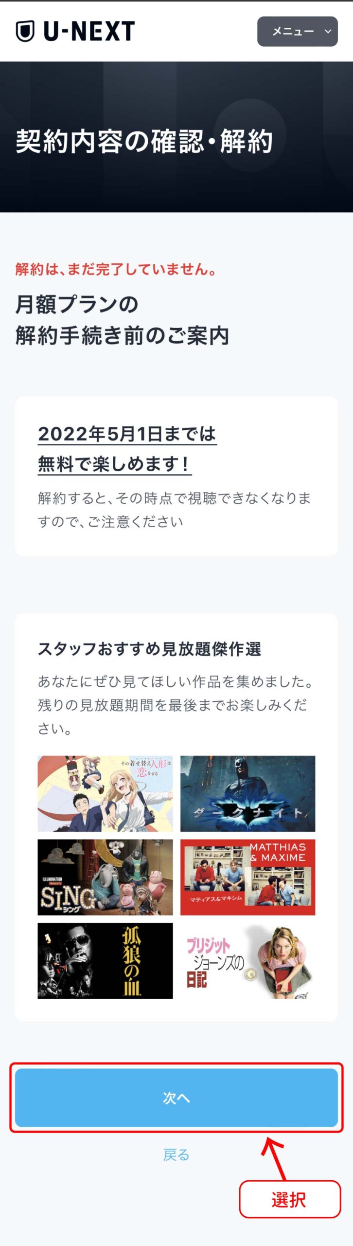 5. 解約手続き前の案内を確認したら下の「次へ」を選択、クリックしてください。