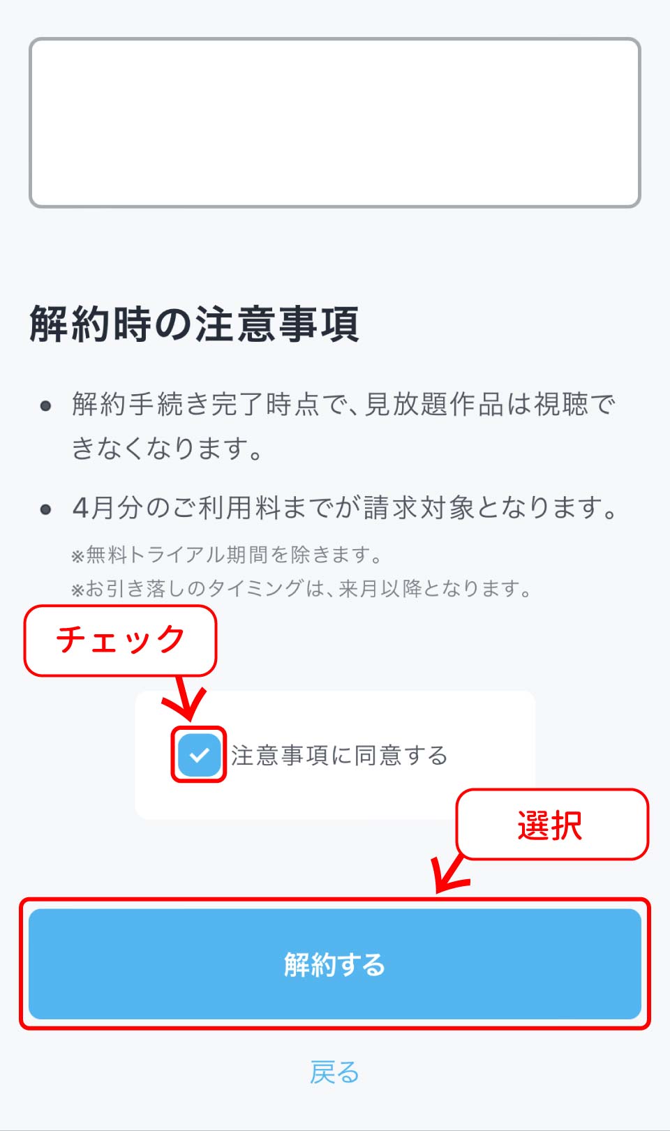 7. 必ず「注意事項に同意する」にチェックをし、「解約する」を選択してください。