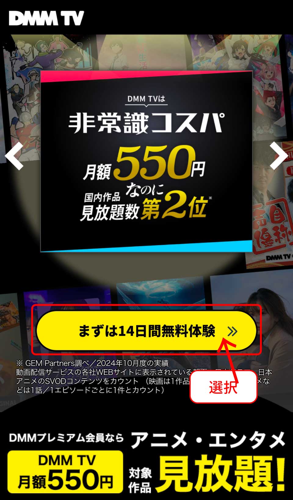 1. DMM TVトップ画面の「まずは14日間無料体験」を選択してください。