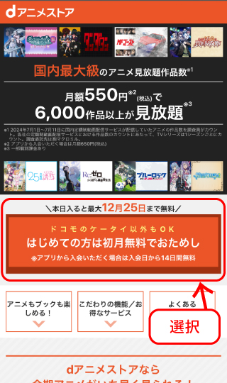 - dアニメストアトップ画面の「初めての方は初月無料でおためし」のボタンを選択します。