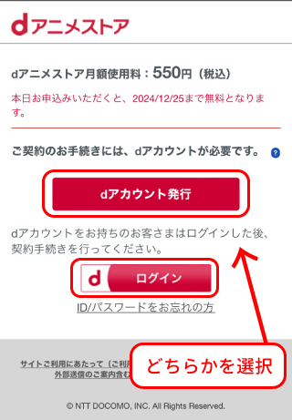 - dアカウントを持っていない場合は、「dアカウント発行」のボタンを、持っている場合は「ログイン」のボタンを選択します。