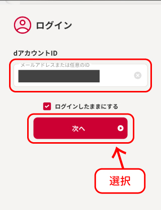 ※以降、本サイトでは“dアカウントを持っている場合”に沿って説明をします。“dアカウントを持っていない場合”本説明以外の項目について入力を求められる場合があります。(dアカウント作成自体は無料で完了できます。) - dアカウントIDを入力し「次へ」のボタンを選択します。(「ログインしたままにする」のチェックボックスのチェックはどちらでも構いません。)