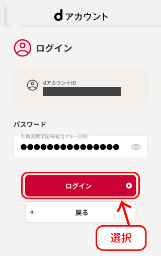 - dアカウントのパスワードを入力し、「ログイン」のボタンを選択します。