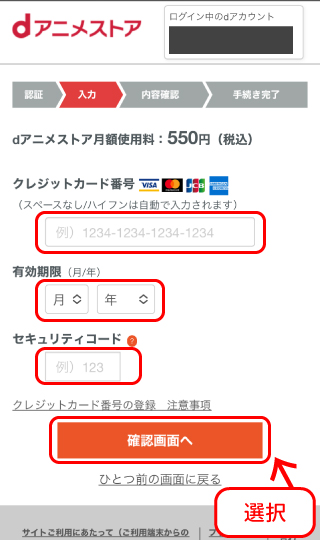 クレジットカード番号・有効期限・セキュリティコードを入力し、「確認画面へ」のボタンを選択します。