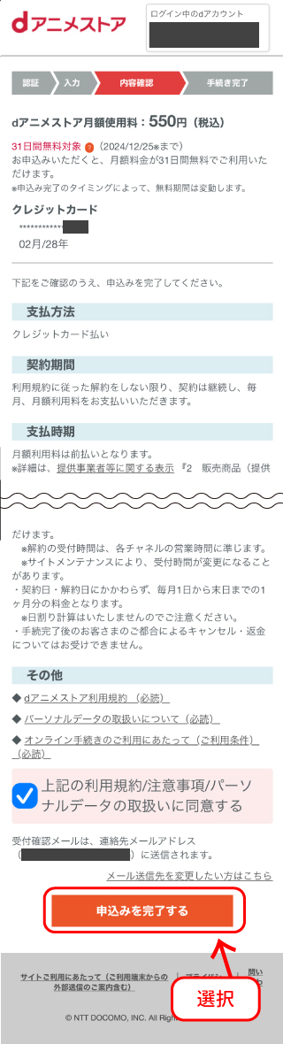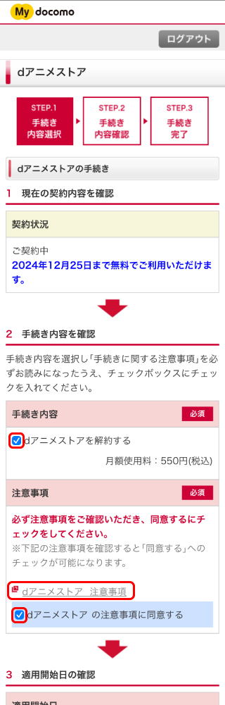 また、「dアニメストア 注意事項」のリンクを選択し、内容を確認した後、「dアニメストアの注意事項に同意する」のチェックボックスにチェックをつけます。